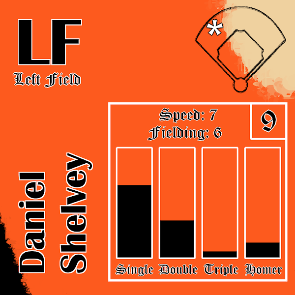 🍴 Plate Discipline = 9: Masterful The most important hitter property. Determines how likely the hitter is to gain control of the At-Bat 👟 Speed = 7: Fast Allows the hitter to sometimes snag an extra base 🕸️ Fielding = 6: Above Average How likely or unlikely that player is to commit an error in the field